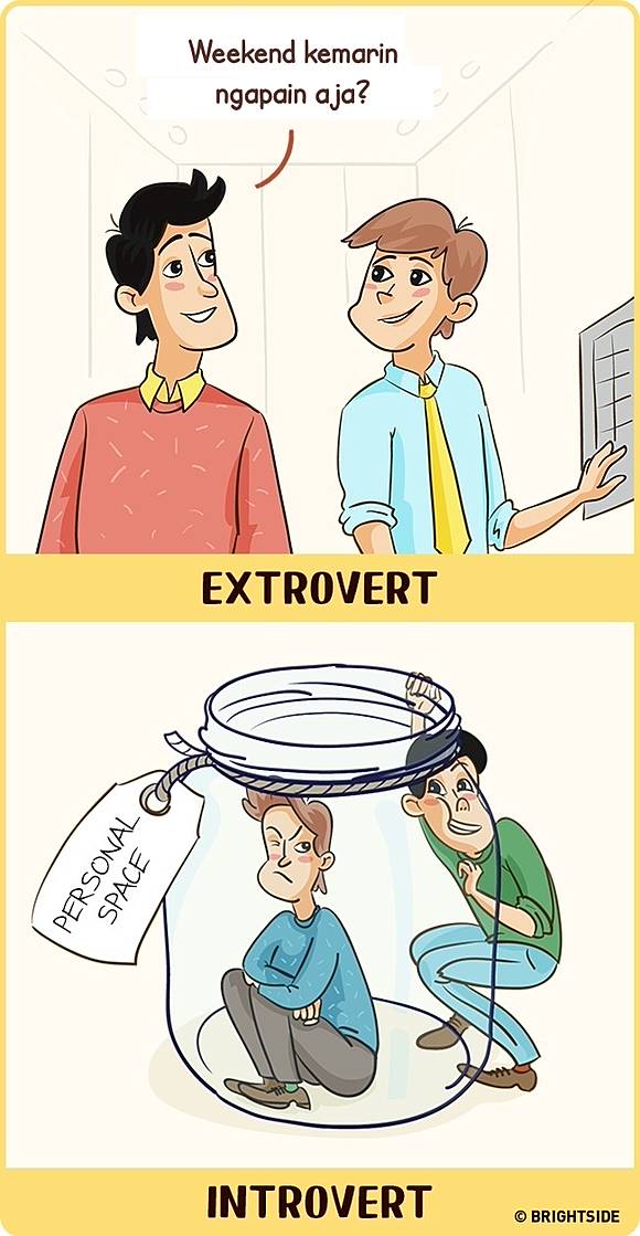 Mungkin teman - teman semua sudah tidak asing dengan istilah 'introvert' dan 'ekstrovert', yup keduanya adalah tipe kepribadian seseorang. Sebelum melihat lebih jauh perbandingannya melalui media gambar, saya akan menjelaskan dulu pengertian dari introvert dan extrovert ini.